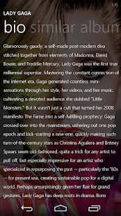 Leer los comentarios de los álbumes, biografías de artistas, los mejores pistas, listas de reproducción, artistas relacionados y podcasts (audio / video) todo en una sola aplicación.
